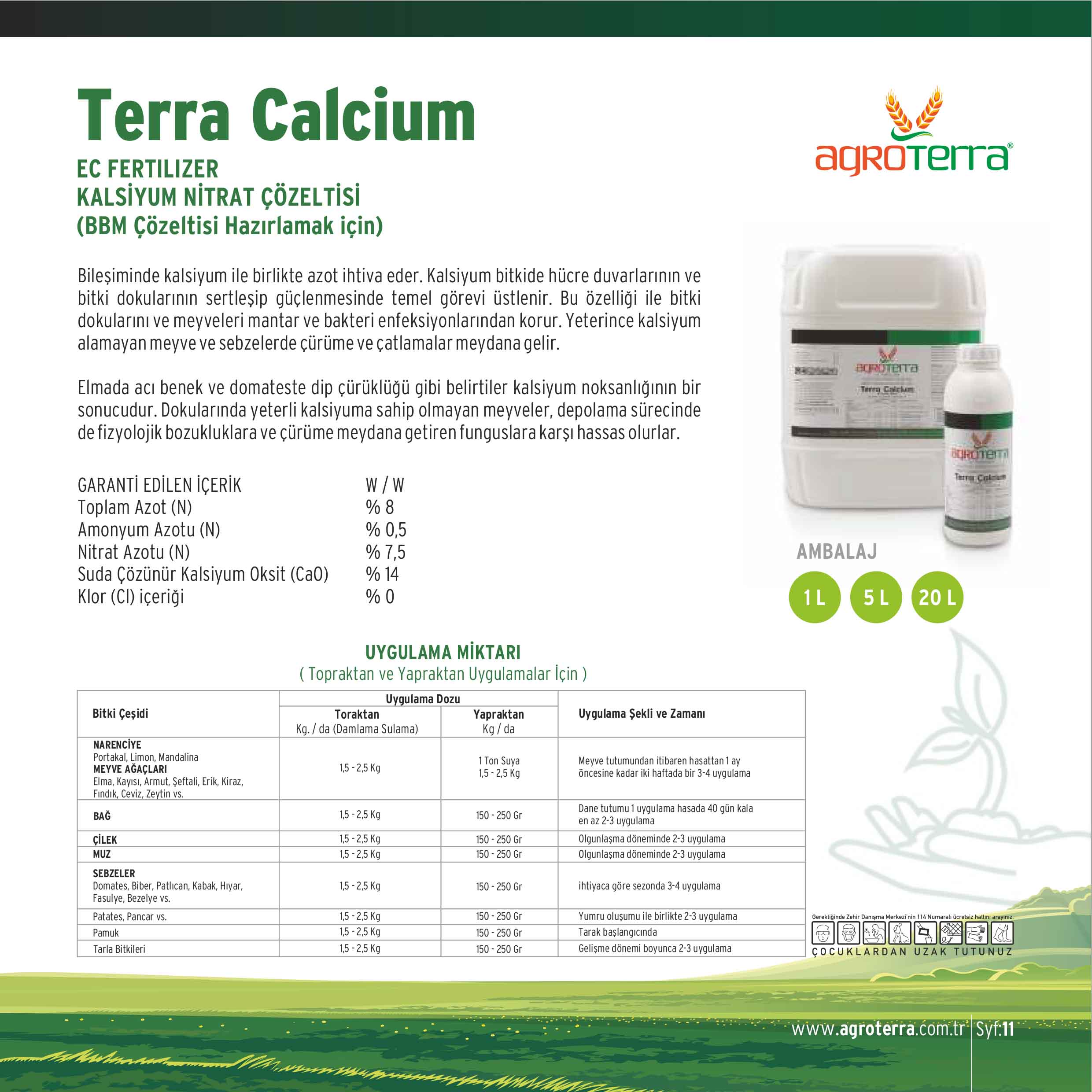 Bileşiminde kalsiyum ile birlikte azot ihtiva eder. Kalsiyum bitkide hücre duvarlarının ve bitki dokularının sertleşip güçlenmesinde temel görevi üstlenir. Bu özelliği ile bitki dokularını ve meyveleri mantar ve bakteri enfeksiyonlarından korur. Yeterince kalsiyum alamayan meyve ve sebzelerde çürüme ve çatlamalar meydana gelir. Elmada acı benek ve domateste dip çürüklüğü gibi belirtiler kalsiyum noksanlığının bir sonucudur. Dokularında yeterli kalsiyuma sahip olmayan meyveler, depolama sürecinde de fizyolojik bozukluklara ve çürüme meydana getiren funguslara karşı hassas olurlar.