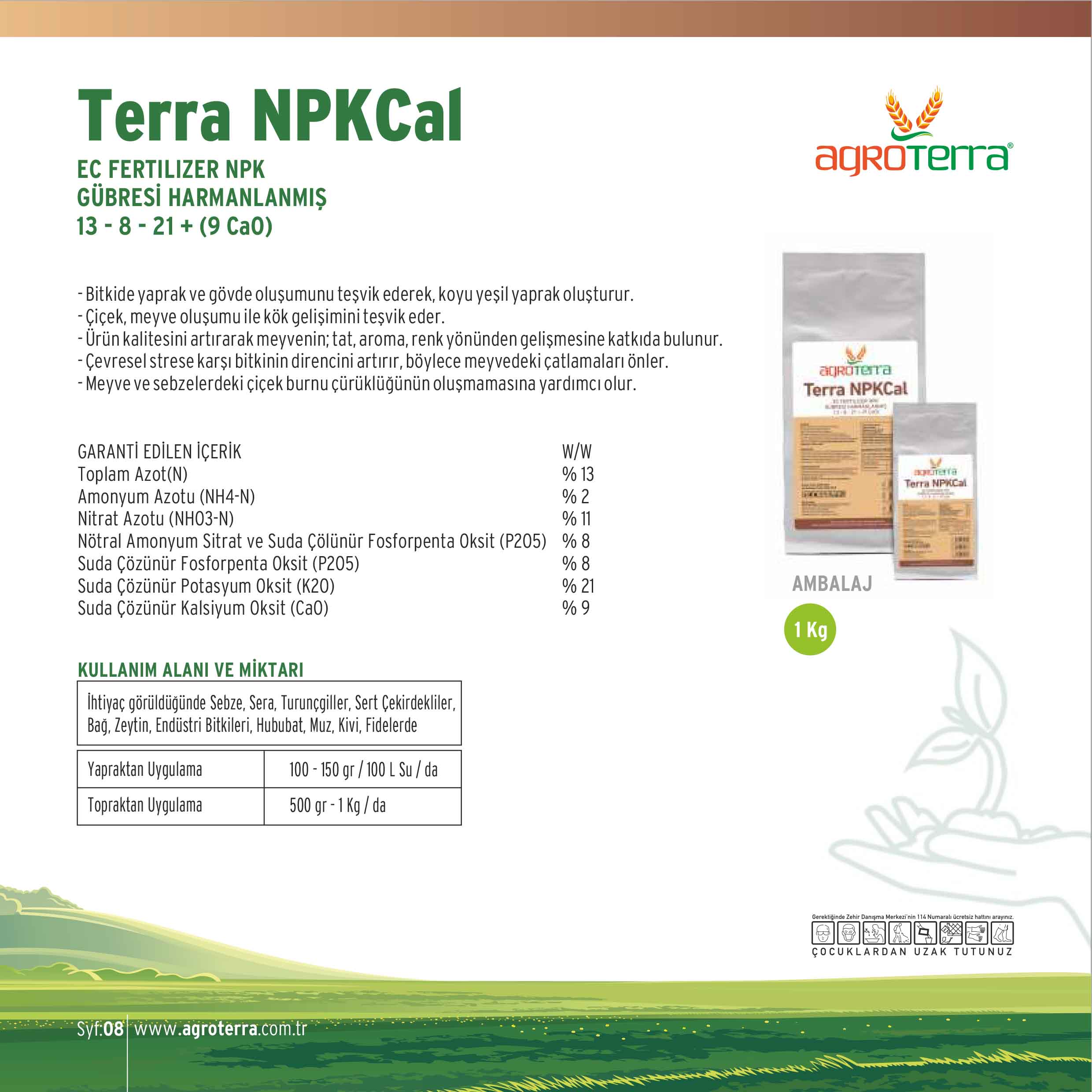 Terra NPKCal, bitkinin tüm gelişim evrelerinde ihtiyaç duyduğu azot (N), fosfor (P), potasyum (K) ve kalsiyum (Ca) elementlerini dengeli biçimde içeren, yüksek etkili bir bitki besleme çözümüdür.
